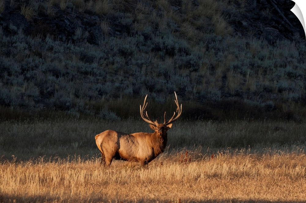 <p>Bull elk (Cervus canadensis) stands in a prairie and looks at the camera in Yellowstone National Park, Wyoming, United States of America</p>