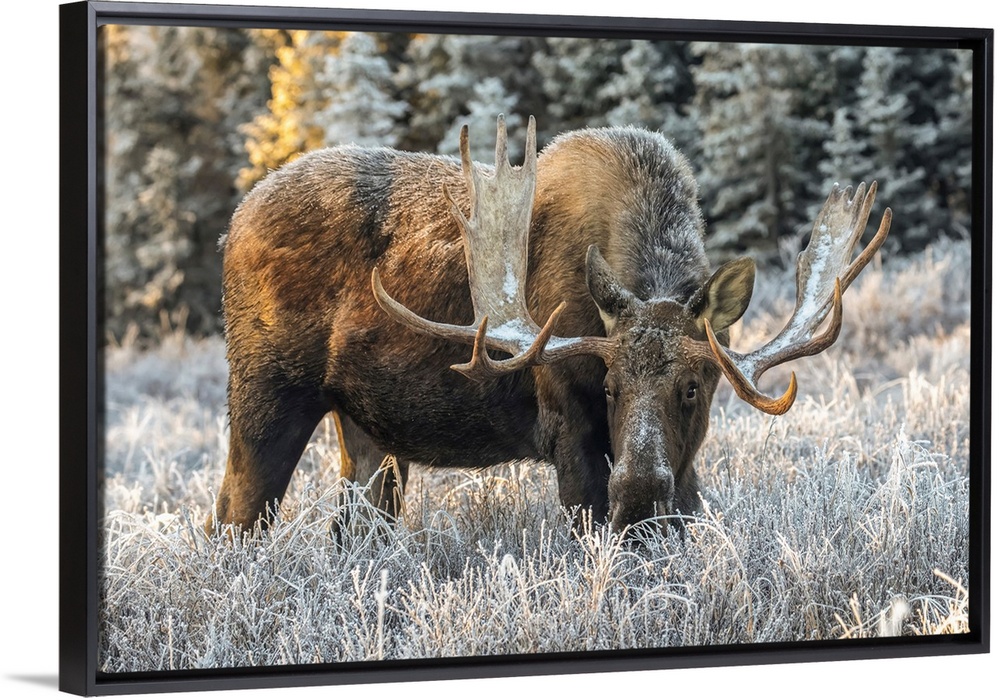 <p>Mature bull moose (alces alces) feeding in early morning with hoar frost in in the field, south anchorage, south-central Alaska, united states of America.</p>