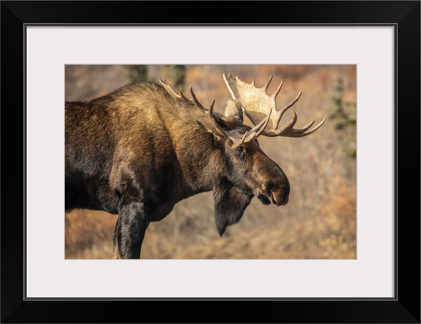 <p>Bull moose (alces alces) in autumn during rut season, Denali national park and preserve, interior Alaska, united states of America.</p>