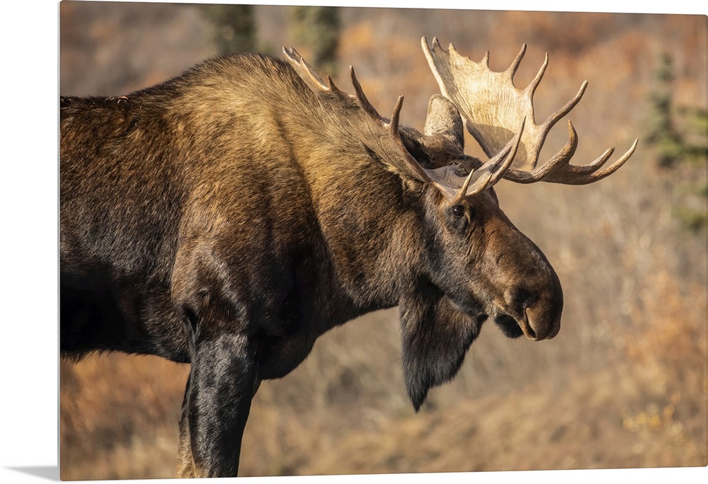 <p>Bull moose (alces alces) in autumn during rut season, Denali national park and preserve, interior Alaska, united states of America.</p>