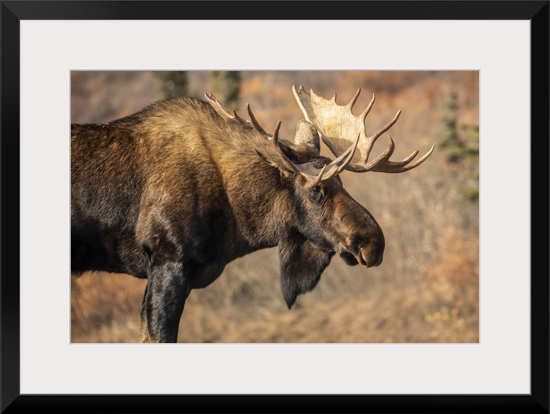 <p>Bull moose (alces alces) in autumn during rut season, Denali national park and preserve, interior Alaska, united states of America.</p>