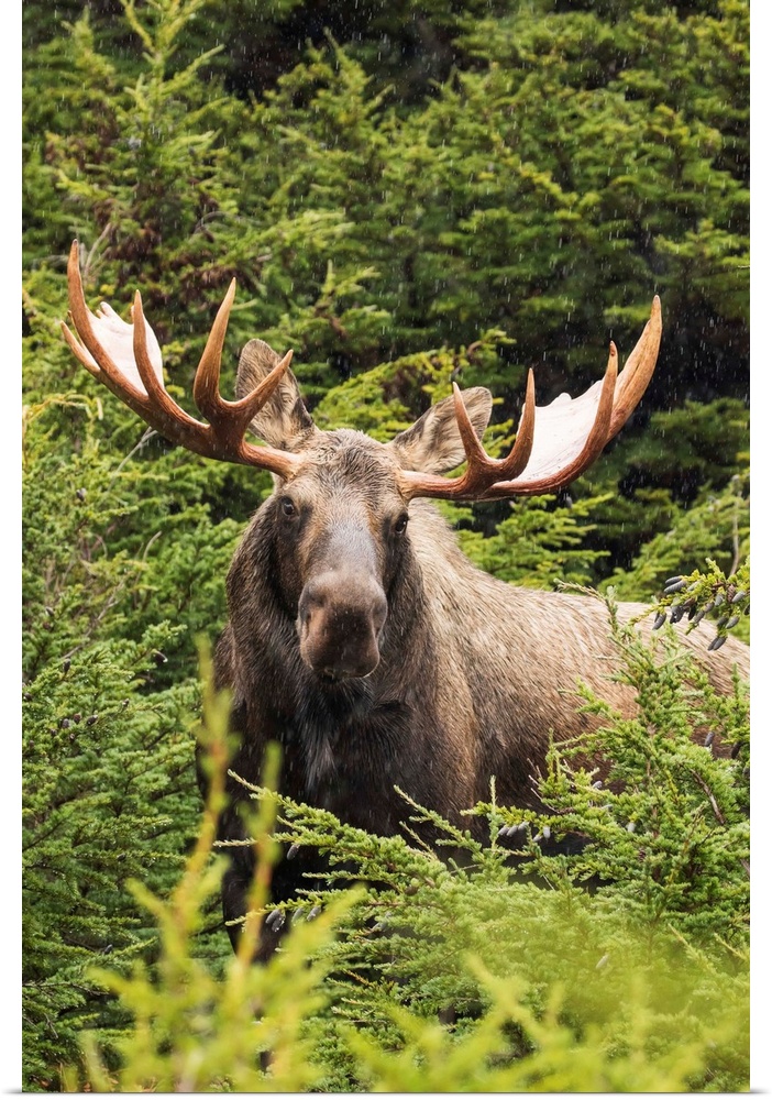 <p>Bull moose (alces alces) in rutting period, Powerline Pass, South-central Alaska, Alaska, United States of America.</p>
