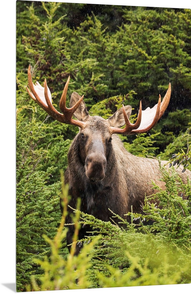 <p>Bull moose (alces alces) in rutting period, Powerline Pass, South-central Alaska, Alaska, United States of America.</p>