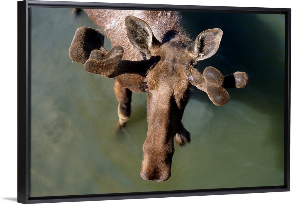 <p>Overlooking view of bull moose in velvet in pond, summer, Alaska wildlife conservation center captive.</p>