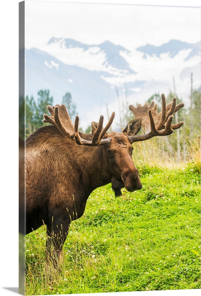 <p>Bull moose (alces alces) with antlers in velvet, captive in Alaska Wildlife Conservation Center, South-central Alaska, Portage, Alaska, United States of America.</p>