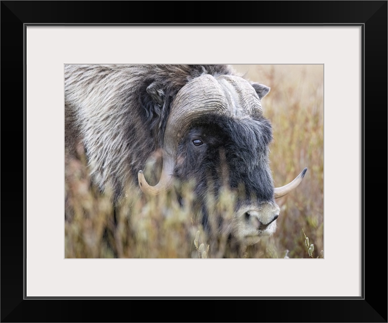 <p>Bull muskox (Ovibos moschatus) pauses on the tundra outside of Nome, Alaska. The Alaska Department of Fish and Game writes, 'At the close of the last ice age, muskoxen were found across northern Europe, Asia, Greenland and North America, including Alaska. By the mid-1800s, muskox had disappeared from Europe and Asia. By the 1920s, muskox had also disappeared from Alaska, with the only remaining animals being found in east Greenland and Arctic Canada. International concern over impending extinction of this animal led to an effort to restore a population in Alaska.'; Nome, Alaska, United States of America.</p>