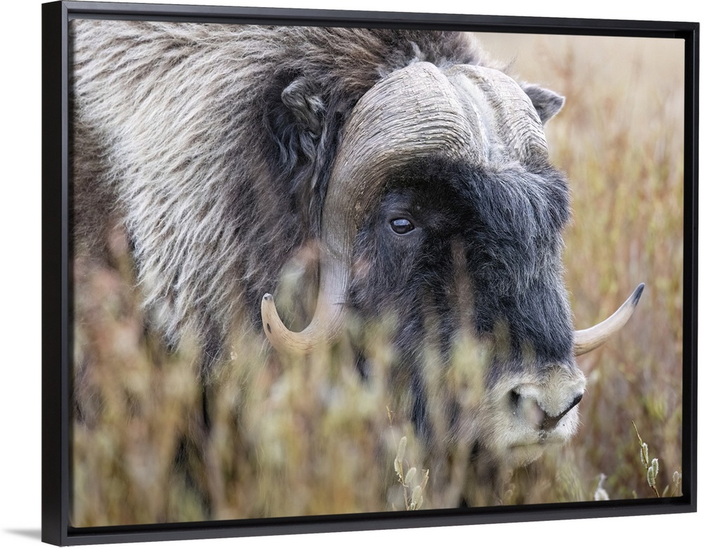 <p>Bull muskox (Ovibos moschatus) pauses on the tundra outside of Nome, Alaska. The Alaska Department of Fish and Game writes, 'At the close of the last ice age, muskoxen were found across northern Europe, Asia, Greenland and North America, including Alaska. By the mid-1800s, muskox had disappeared from Europe and Asia. By the 1920s, muskox had also disappeared from Alaska, with the only remaining animals being found in east Greenland and Arctic Canada. International concern over impending extinction of this animal led to an effort to restore a population in Alaska.'; Nome, Alaska, United States of America.</p>