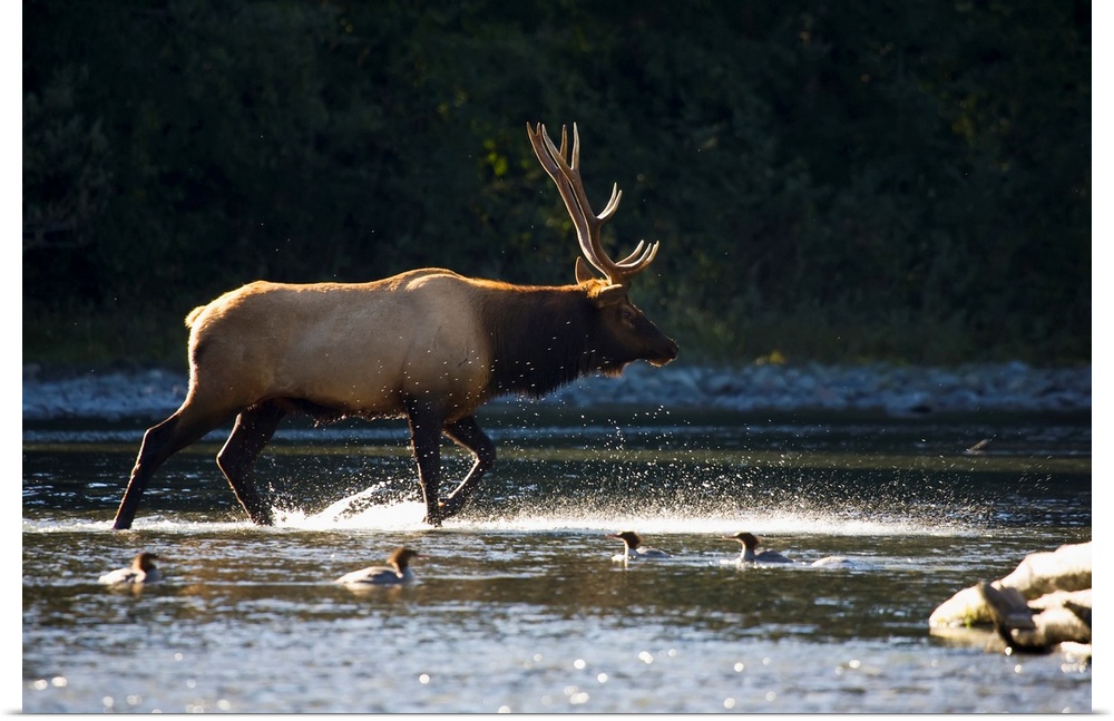 <p>Bull Roosevelt elk (Cervus canadensis roosevelti) crossing river with mergansers in the foreground, Washington.</p>