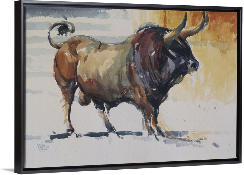 <p>This contemporary artwork illustrates the strength of a bull using impressionistic brush strokes in warm shades of color.</p>