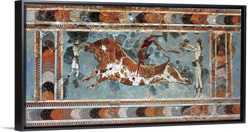 <p>Bullfighting scene. ca. 1500 BC. Fresco of the eastern wing of the palace. Minoan art / Cretan art. Fresco. GREECE. Iraklion. Archaeological Museum. Proc: GREECE. Knossos. Knossos Palace. .. AISA/Everett Collection</p>