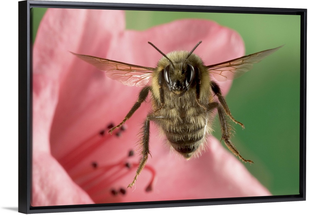 <p>Bumblebee (Bombus huntii) flying toward the camera after collecting nectar from a Rhododendron flower, northeast Oregon</p>