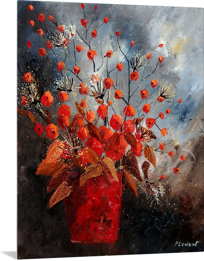 <p>Contemporary painting of a vase of red and white flowers against a neutral backdrop.</p>