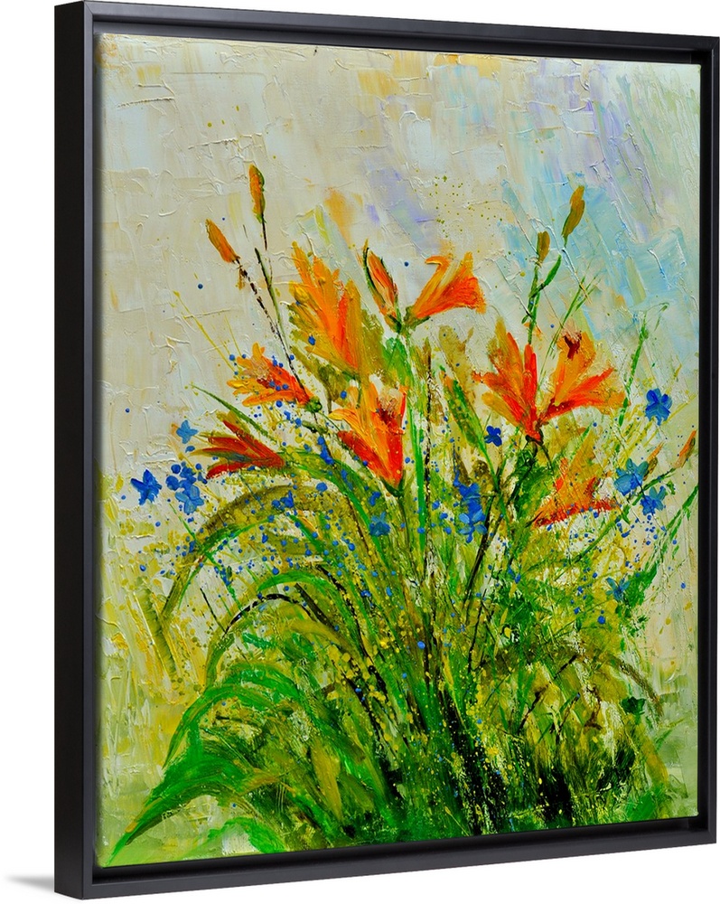 <p>Vertical watercolor painting of a bouquet of orange flowers against a pastel colored backdrop.</p>