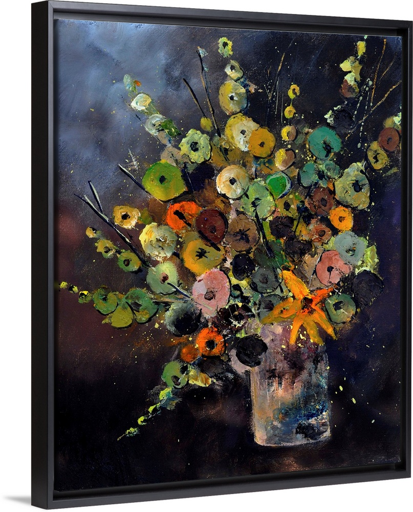 <p>Contemporary painting of a colorful bouquet of flowers in a vase on a dark background.</p>