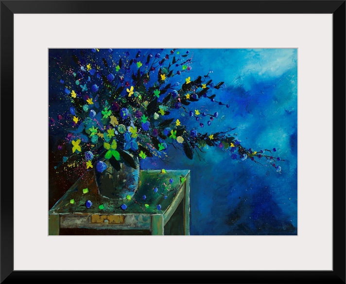 <p>Horizontal painting of a vase full of vibrant colored flowers against of blue and teal backdrop.</p>