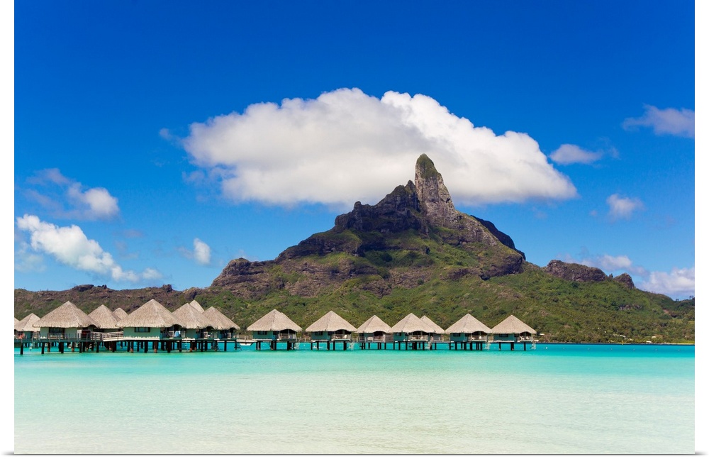 <p>Bungalows on stilts in a lagoon with Mount Otemanu in the near distance.</p>
