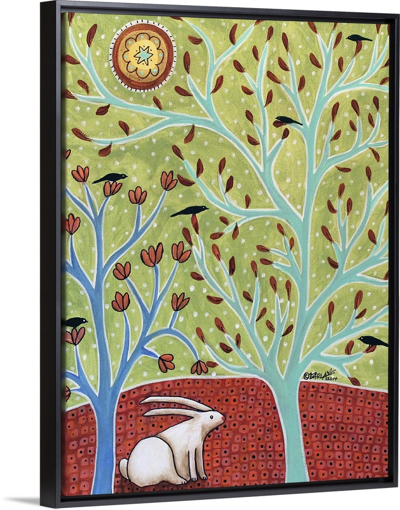 <p>Contemporary painting of a white rabbit in a forest.</p>