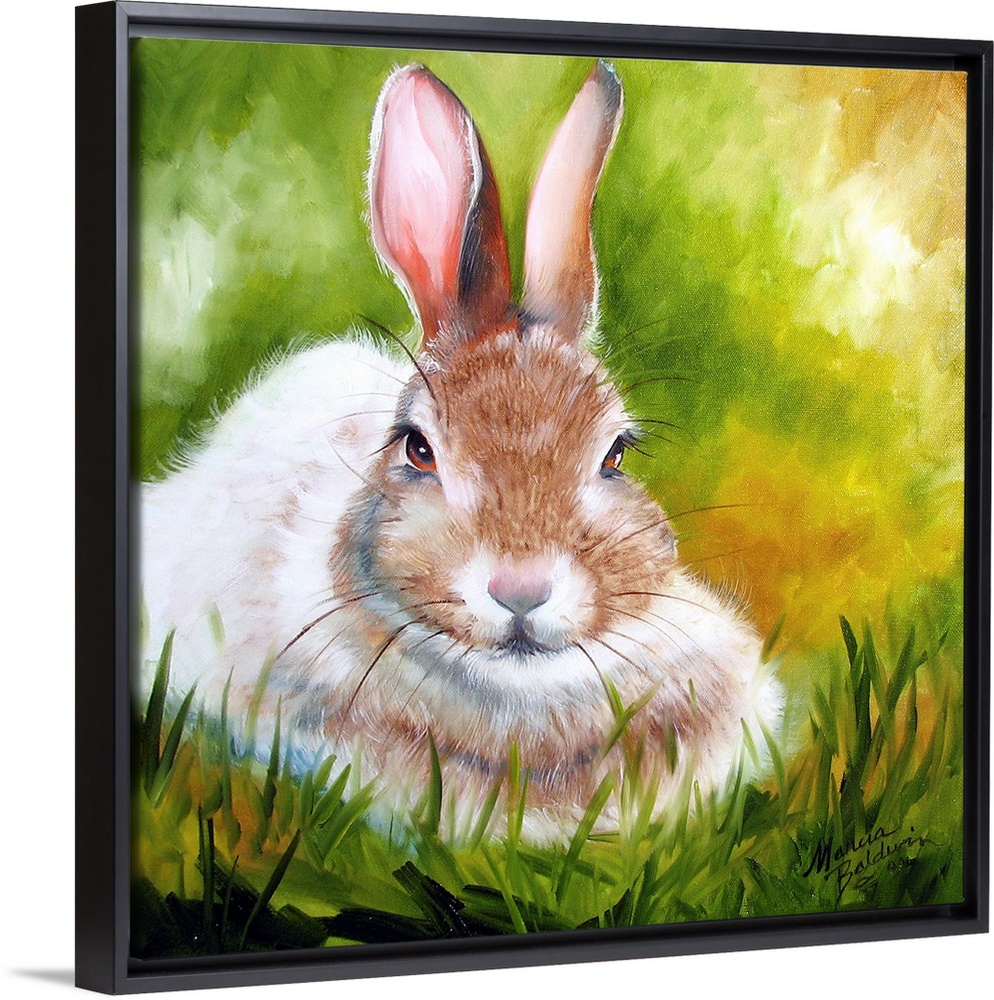 <p>Square painting of a precious bunny on a grassy green, brown, and yellow background.</p>