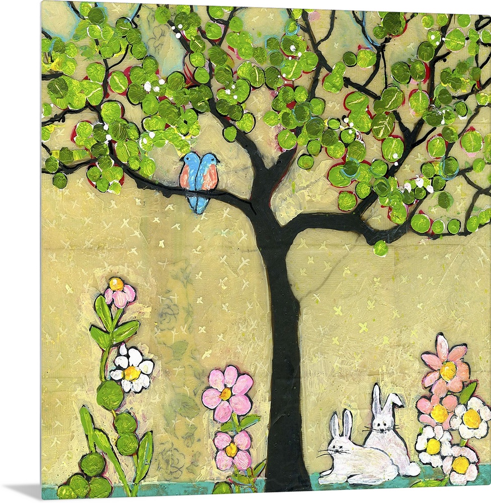 <p>Lighthearted contemporary painting of a tree with blue birds perched on the on the branches.</p>