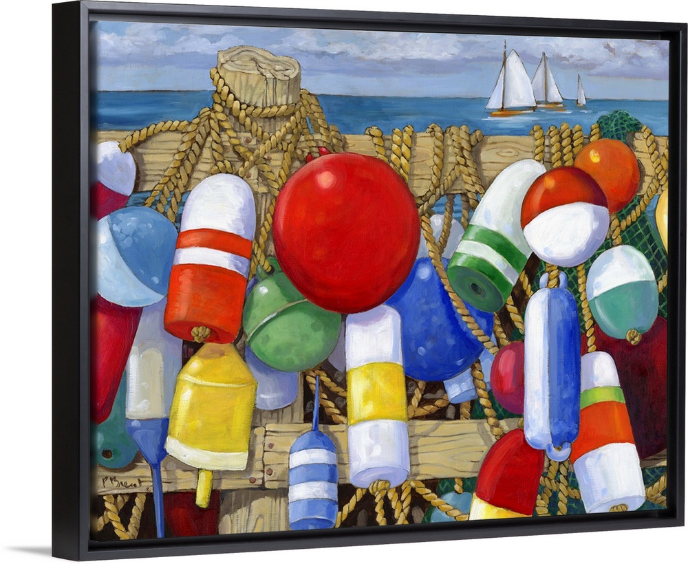 <p>Contemporary painting of a group of buoys and rope hanging on a pier.</p>