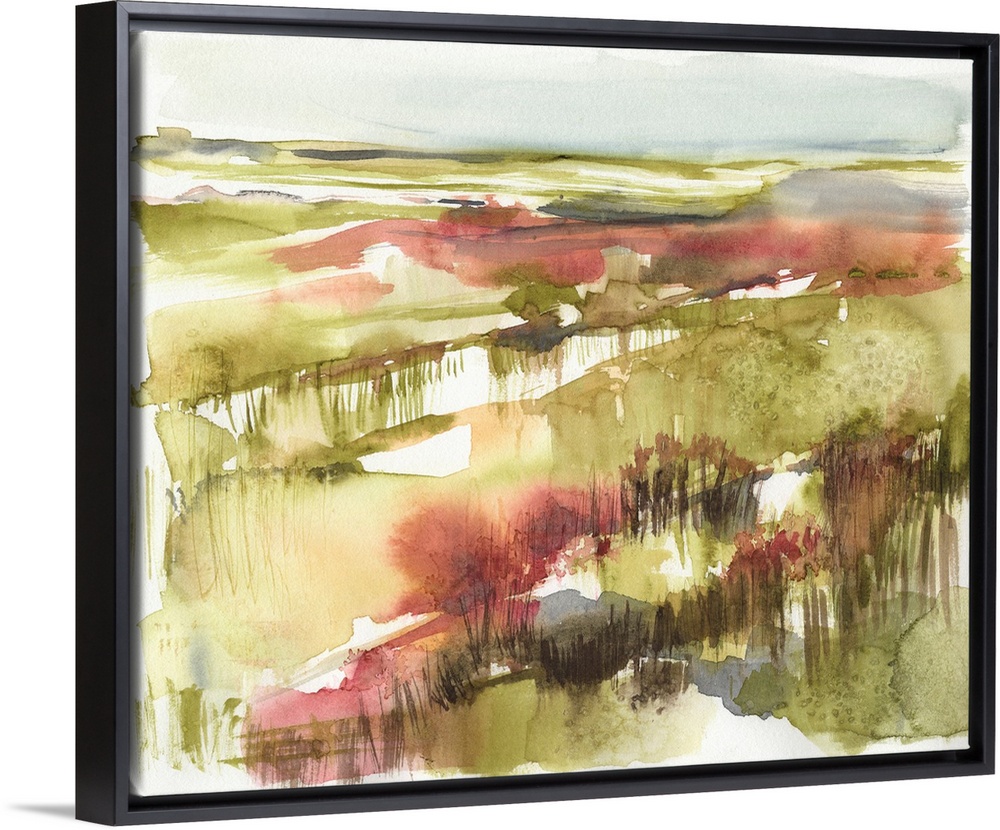 <p>An abstract watercolor landscape in shades of olive and persimmon, suggestive of grasses growing in a marshland</p>
