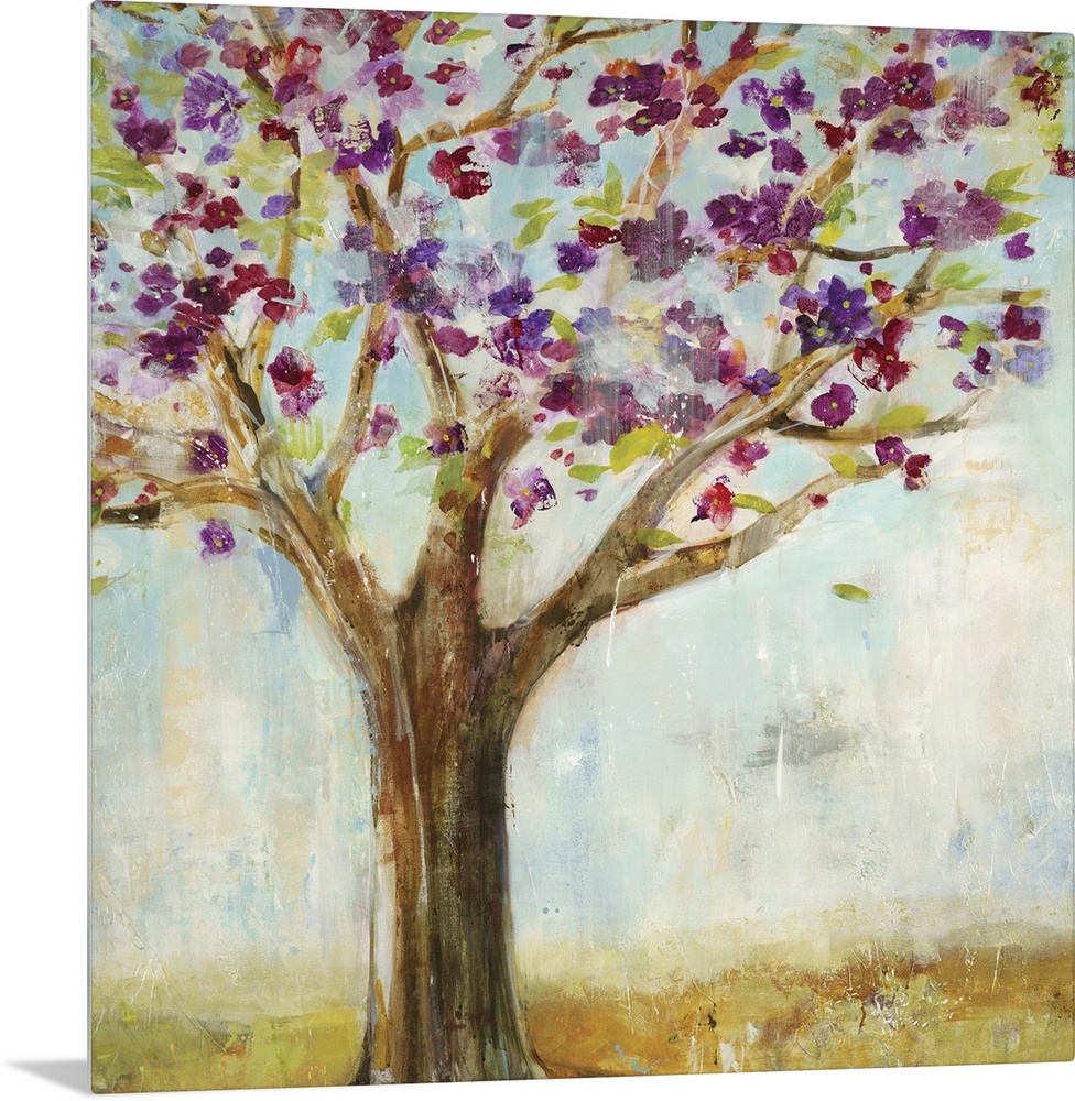 <p>Contemporary painting of a tree with purple blossoming flowers.</p>