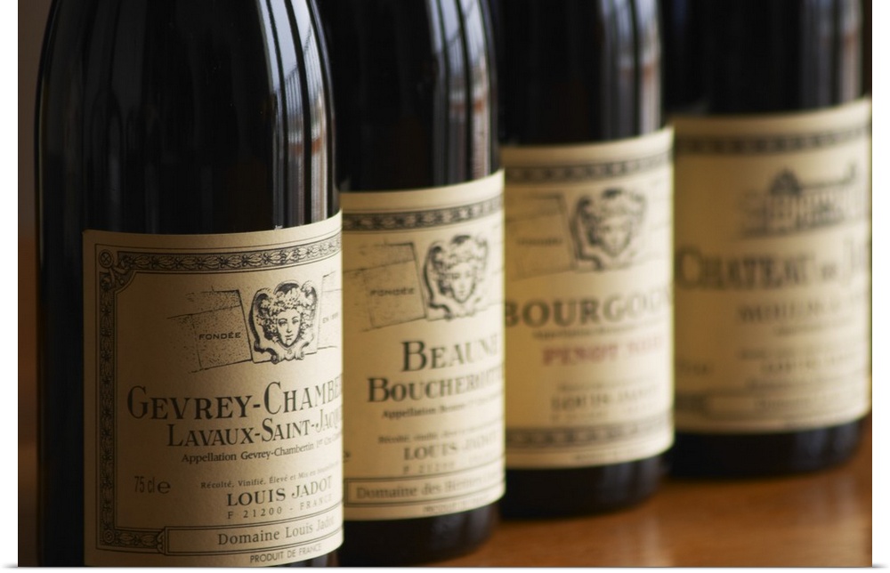 <p>A row of bottles and labels of burgundy wine from maison Louis Jadot Gevrey Chamberting Lavaux Saint St Jacques Premier 1er Cru, Beaune Boucherottes Bourgogne Pinot Noir and Chateau des Jacques Moulin a Vent Beaujolais, red burgundy wine. Profile sidelight sidelit side light lit contour silhouette , Maison Louis Jadot, Beaune C..te Cote d Or Bourgogne Burgundy Burgundian France French Europe European</p>