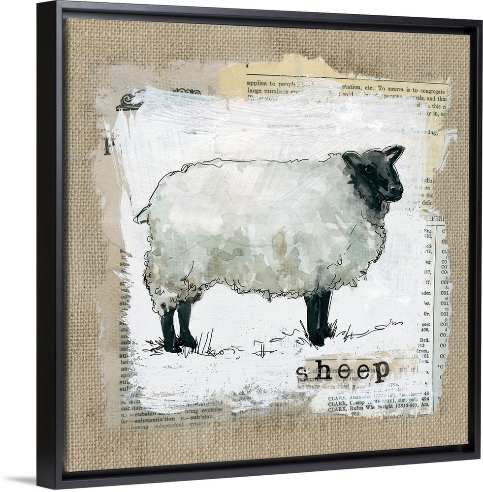 <p>Square burlap collage art of a sheep painted on top of newspaper clippings with the word "sheep" stamped on underneath.</p>