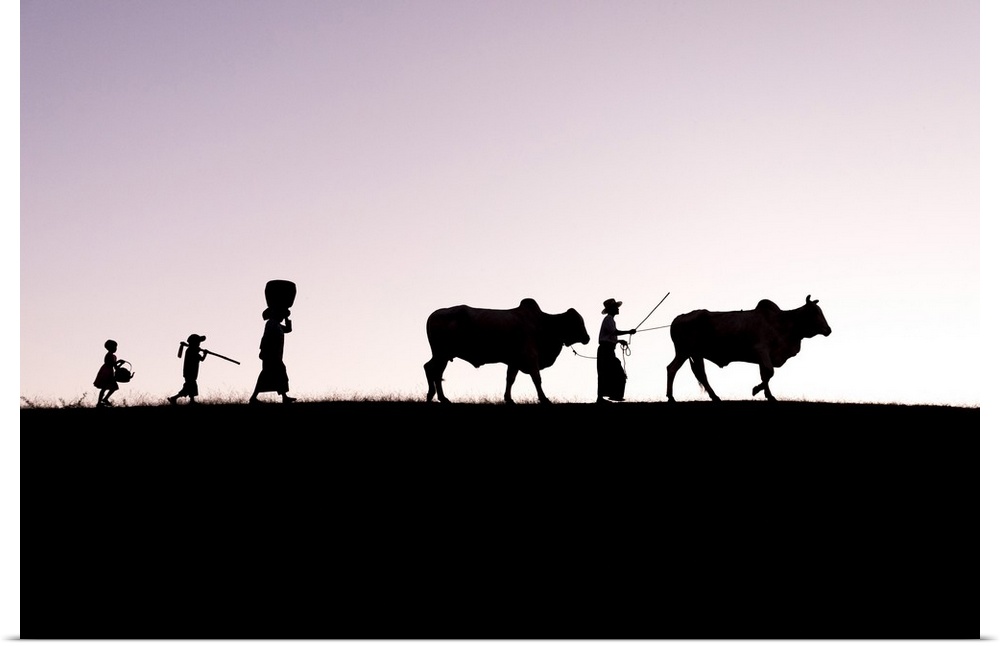<p>Burmese farmers and bulls walk at sunset along the crest of a hill, Bagan, Myanmar.</p>