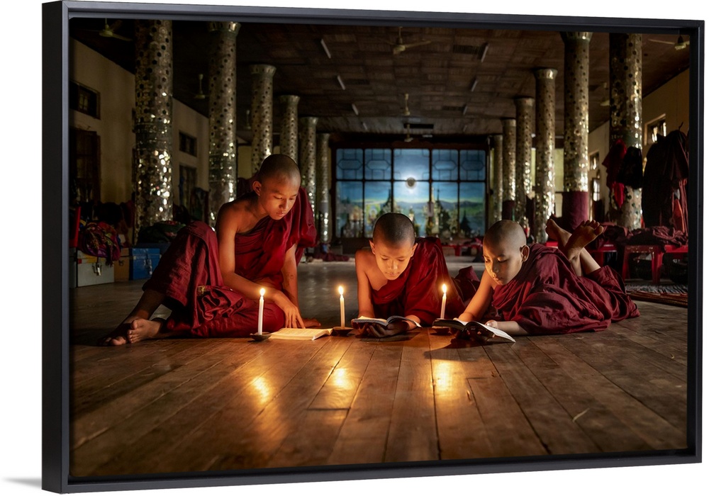 <p>Burmese monks reading by candlelight in their monastery</p>