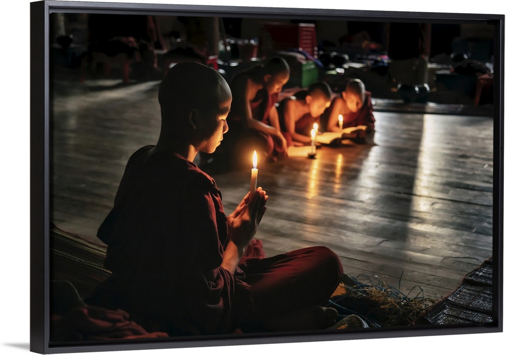 <p>Burmese monks reading by candlelight in their monastery</p>