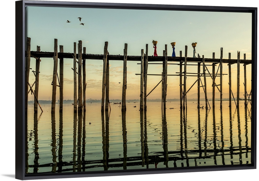 <p>Burmese women walking with baskets on the Ubein Bridge in Mandalay</p>