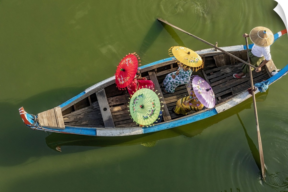 <p>Burmese women with umbrellas boating by the Ubein Bridge in Burma</p>