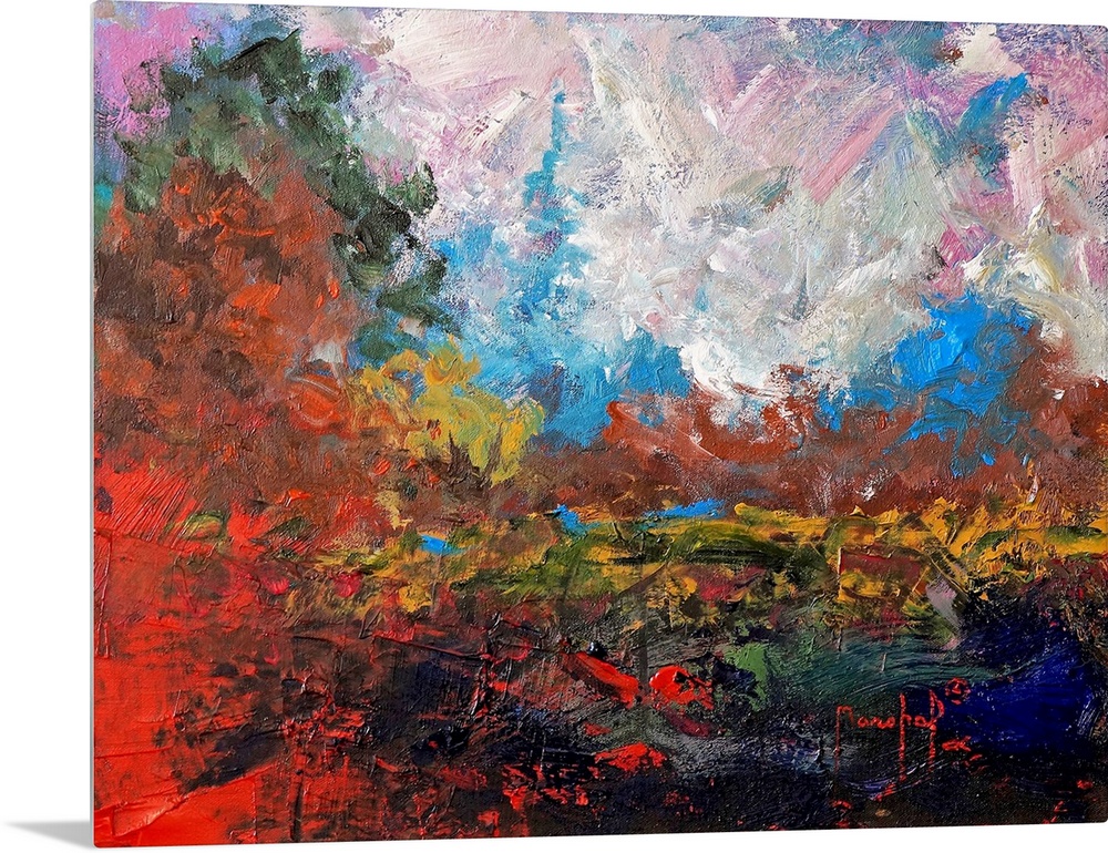 <p>Abstract painting of a colorful landscape with bright red and burnt orange hues.</p>