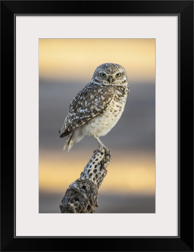 <p>Burrowing owl (athene cunicularia) perched on cholla cactus (cylindropuntia) skeleton, Casa Grande, Arizona, united states of America.</p>