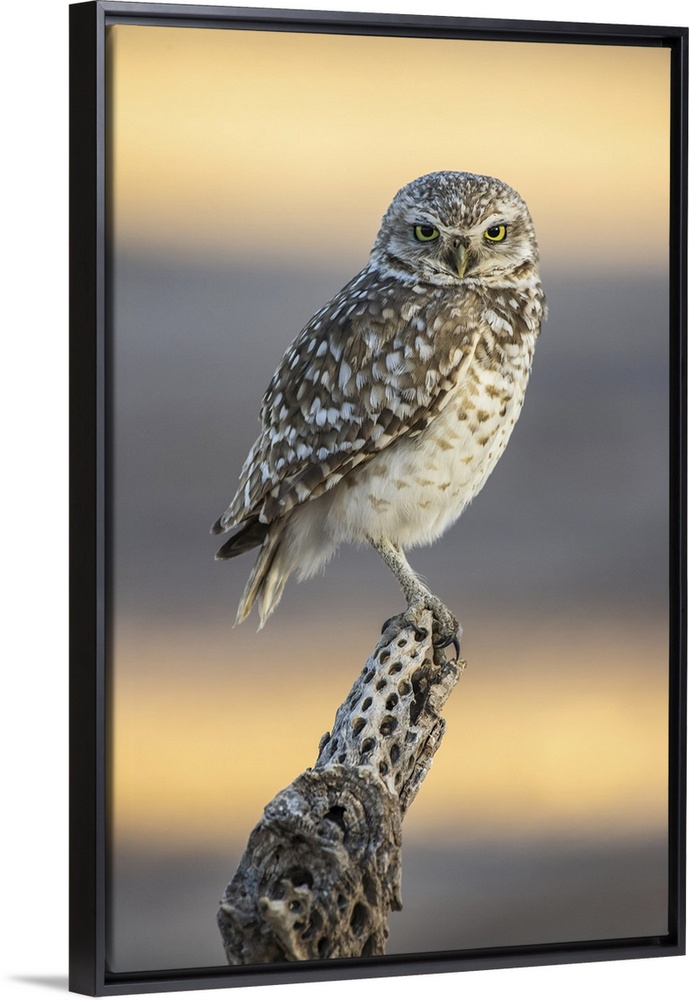 <p>Burrowing owl (athene cunicularia) perched on cholla cactus (cylindropuntia) skeleton, Casa Grande, Arizona, united states of America.</p>