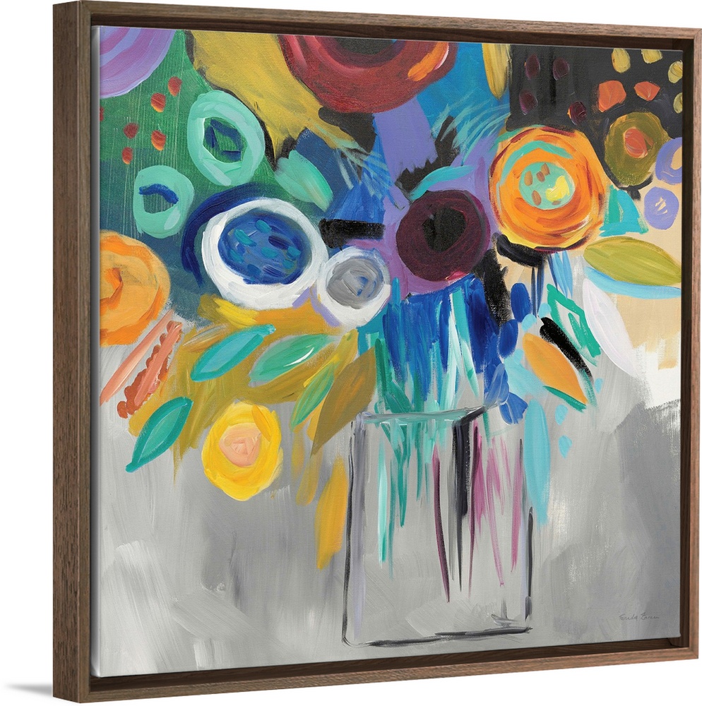 <p>Square abstract painting of a bold floral arrangement on a grey background.</p>