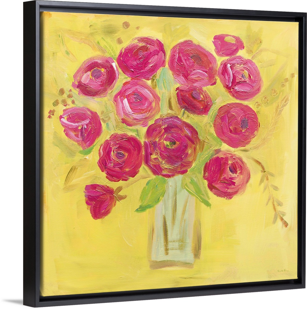 <p>Square contemporary painting of bright pink poppies in a vase with a yellow background.</p>