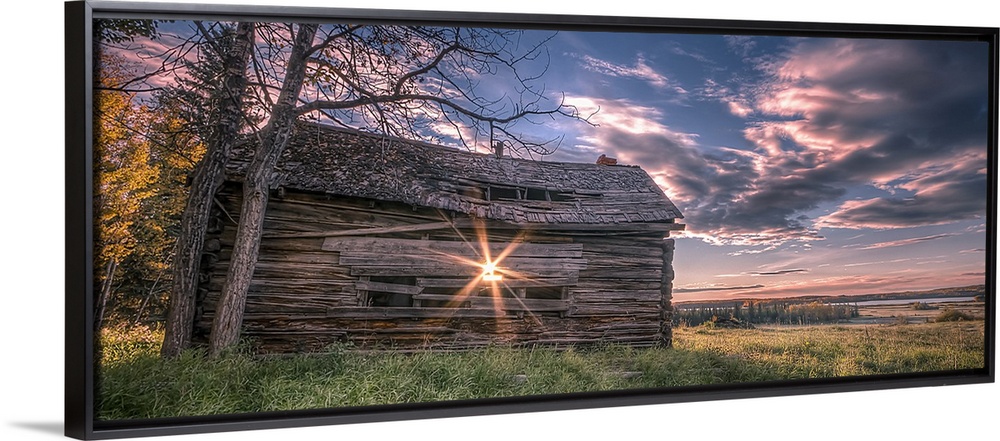 <p>Sunrise beaming through the slats of an old Canadian prairie barn overlooking a field.</p>