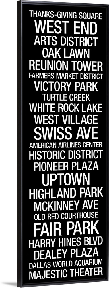 <p>Vertical panoramic typographic design with text describing iconic landmarks in Dallas. Such words include Reunion Tower, Victory Park, Thanks-Giving Square, Dallas World Aquarium, Majestic Theater, and American Airlines Center.</p>