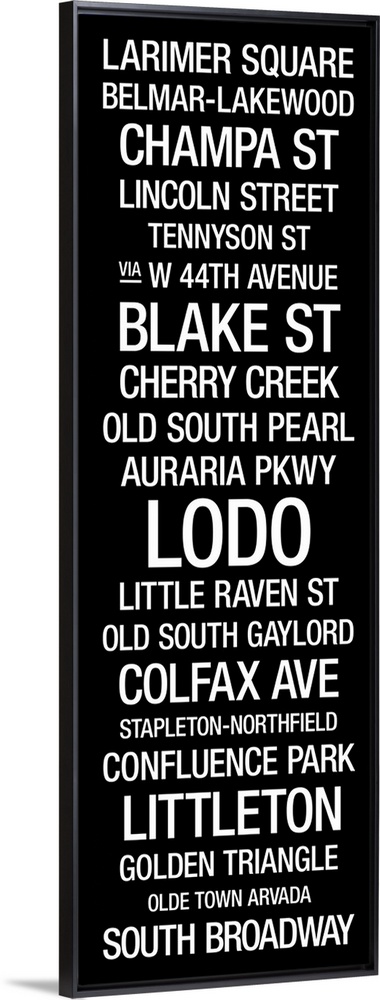 <p>Vintage subway art/bus roll featuring prominent Denver, Colorado (CO) streets, landmarks, and buildings in white lettering on a black background.</p>