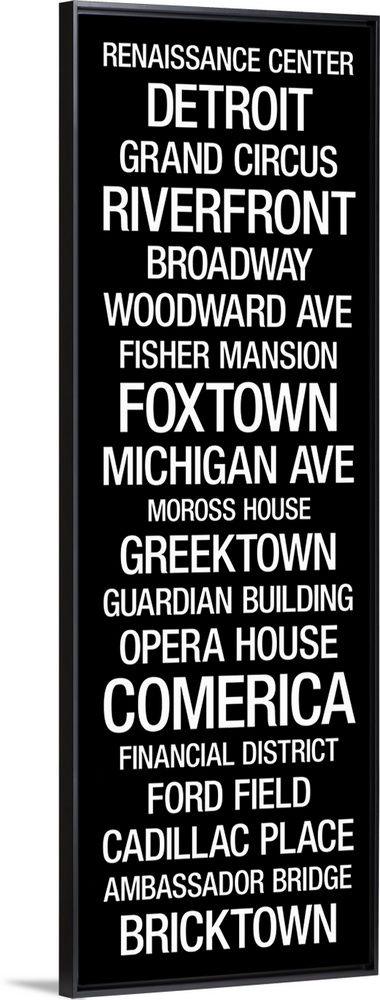 <p>Big vertical canvas art of a bus roll of different areas in Detroit.</p>