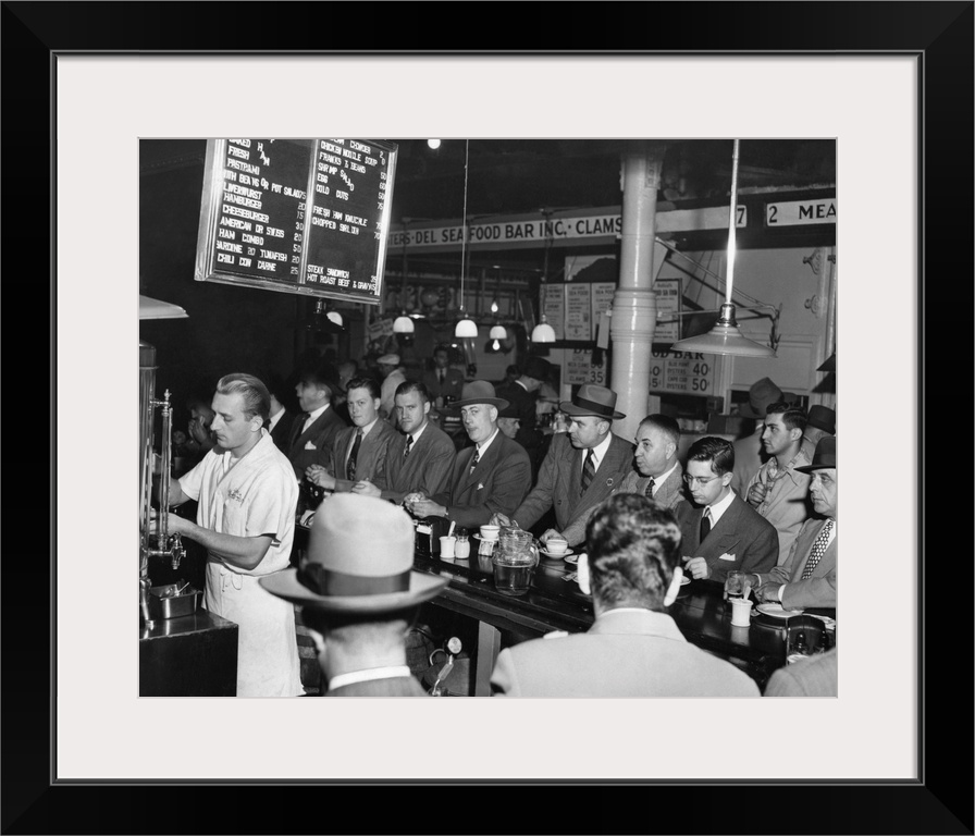 <p>Businessmen eating at Pete's Bar in Washington Market, New York City, 1950.</p>