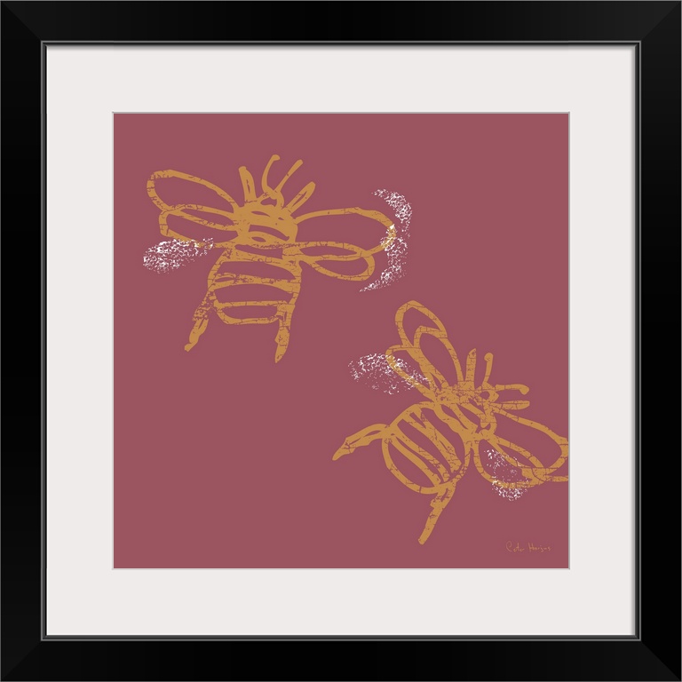 <p>Two yellow busy bees buzzing around depicted in a simple minimalist art fashion on a solid red background.</p>