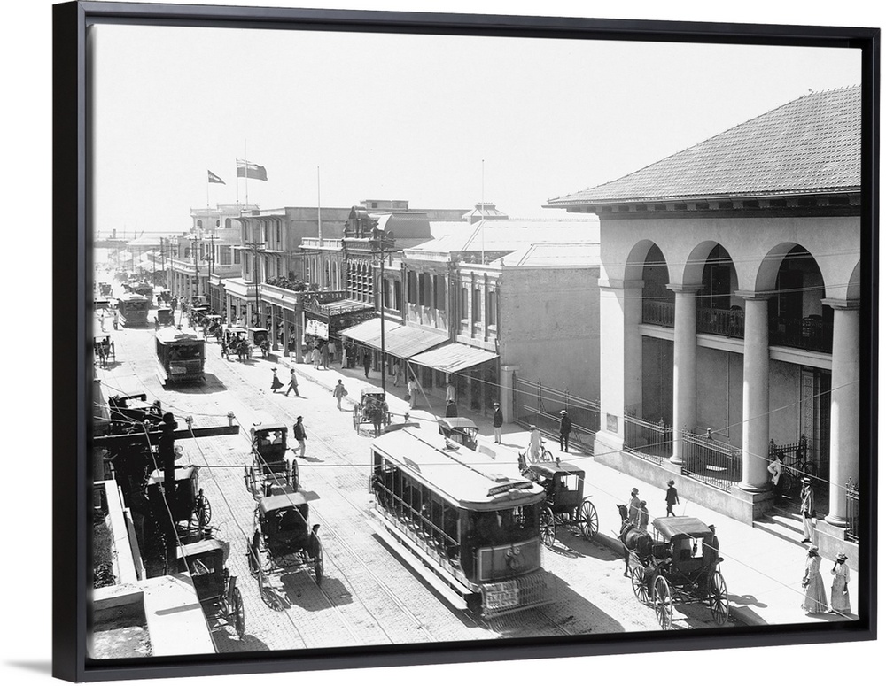 <p>Carriages, trolleys, and pedestrians crowd a busy street in Kingston, Jamaica.</p>