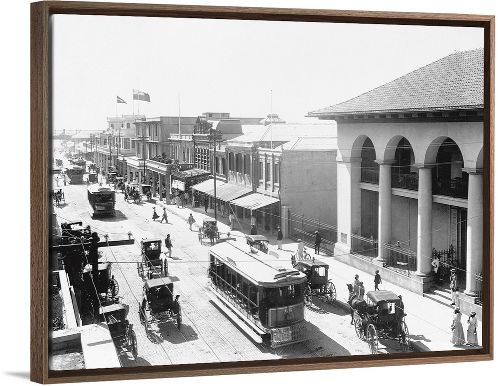 <p>Carriages, trolleys, and pedestrians crowd a busy street in Kingston, Jamaica.</p>