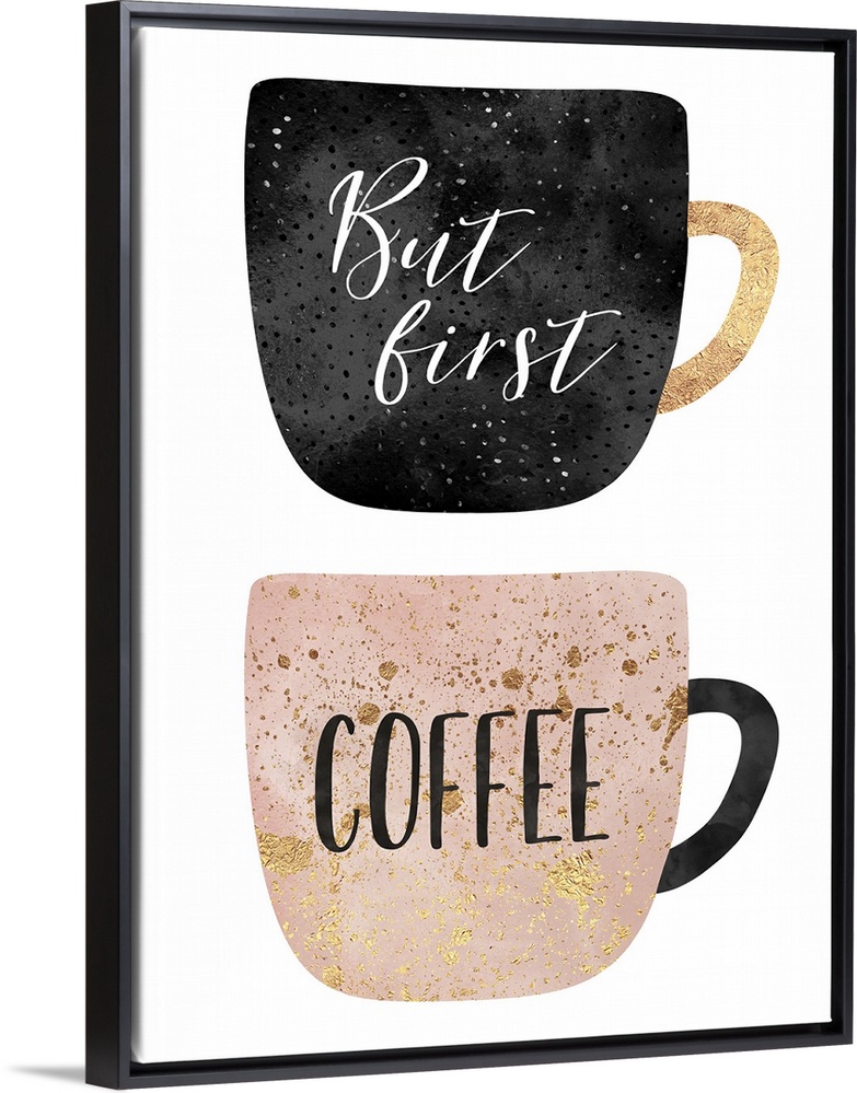 <p>Two mugs, with the words 'But First, Coffee' in shades of rose gold, black and gold on a white background.</p>