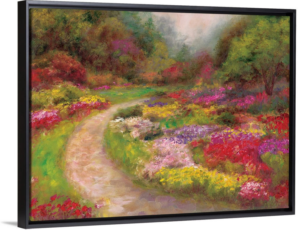 <p>Contemporary artwork of a path in a garden surrounded by flowers.</p>