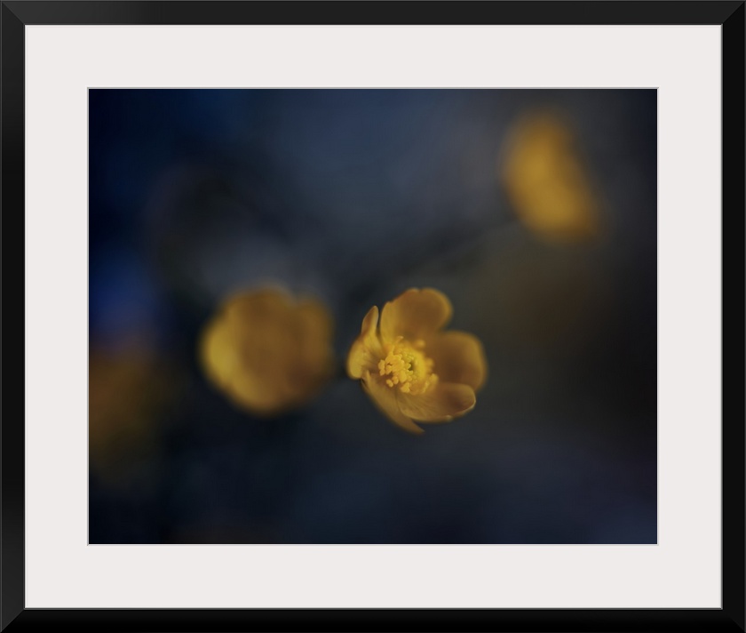<p>Blurred image of yellow flowers with one in focus.</p>