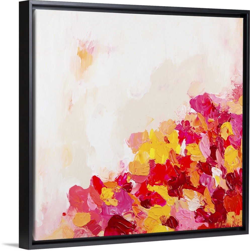 <p>Contemporary artwork with bright red, pink, and yellow in the bottom right corner.</p>
